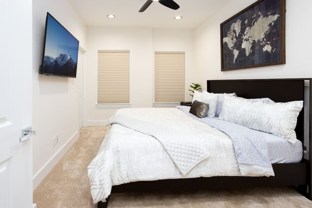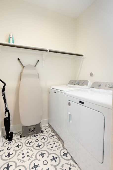 On the second floor, you'll find the master suite with a plush king-size bed, offering a restful retreat. The second bedroom, equally luxurious, features a queen-size bed. These two rooms feel like private master suites, perfect for families traveling together who want their own space. Both rooms come equipped with 65-inch Smart TVs. Also on this level is the fully-stocked laundry room for added convenience.