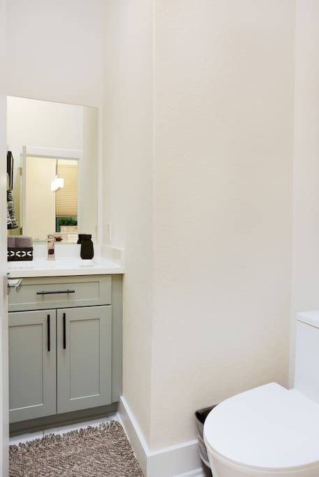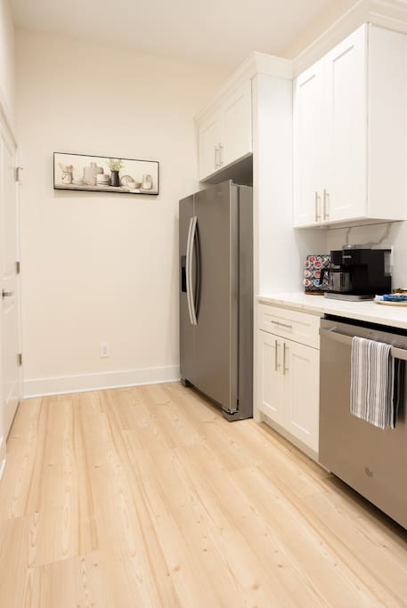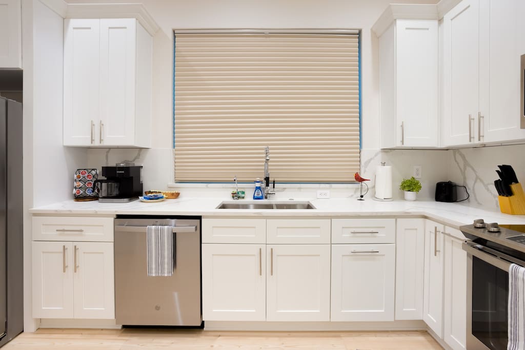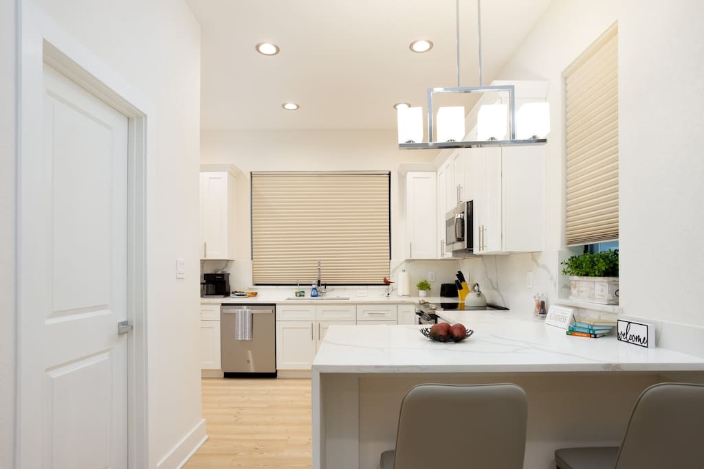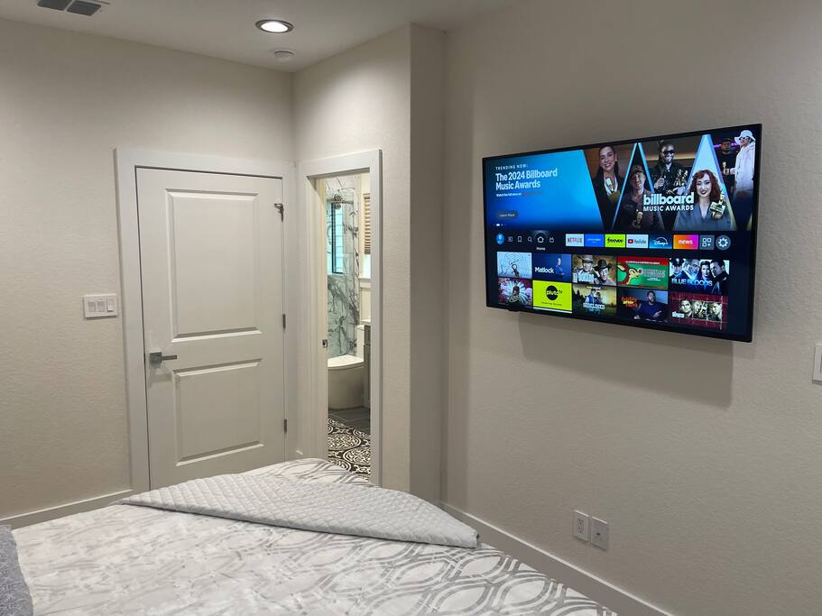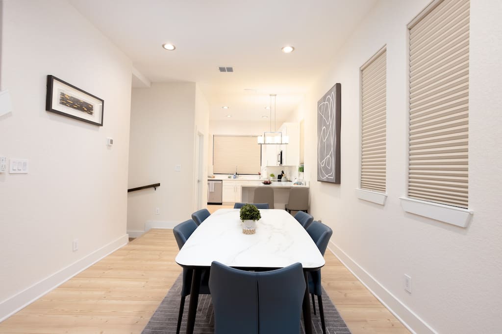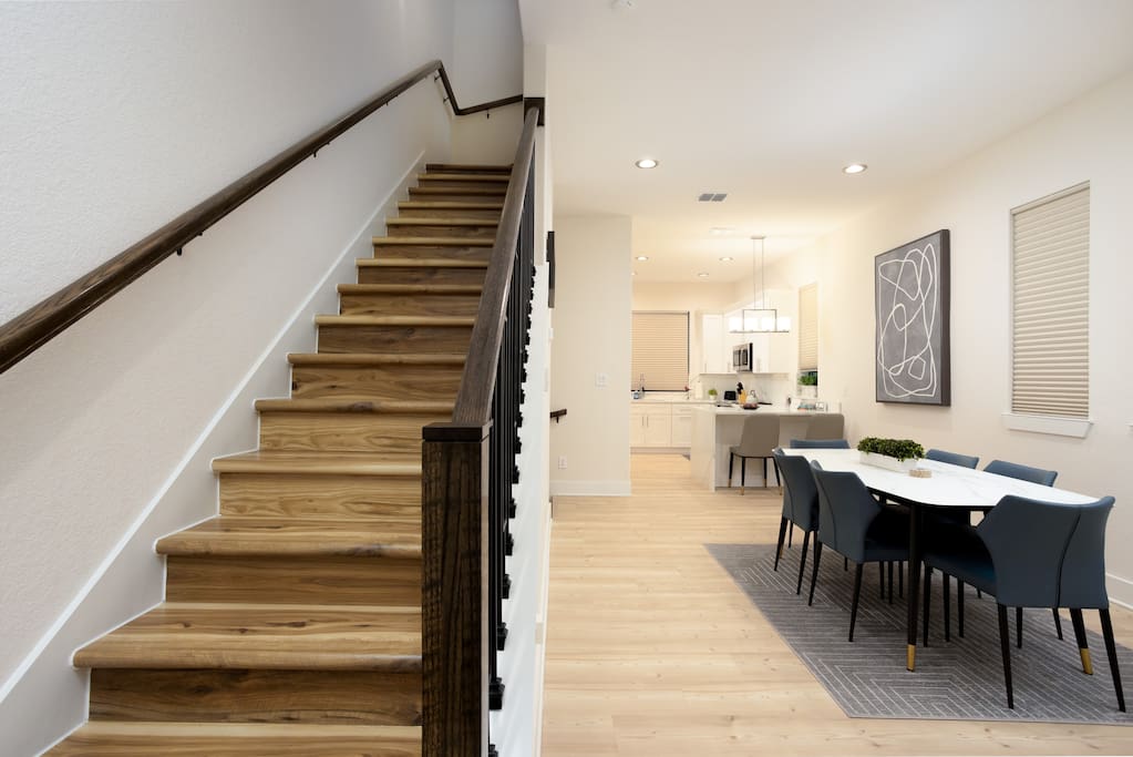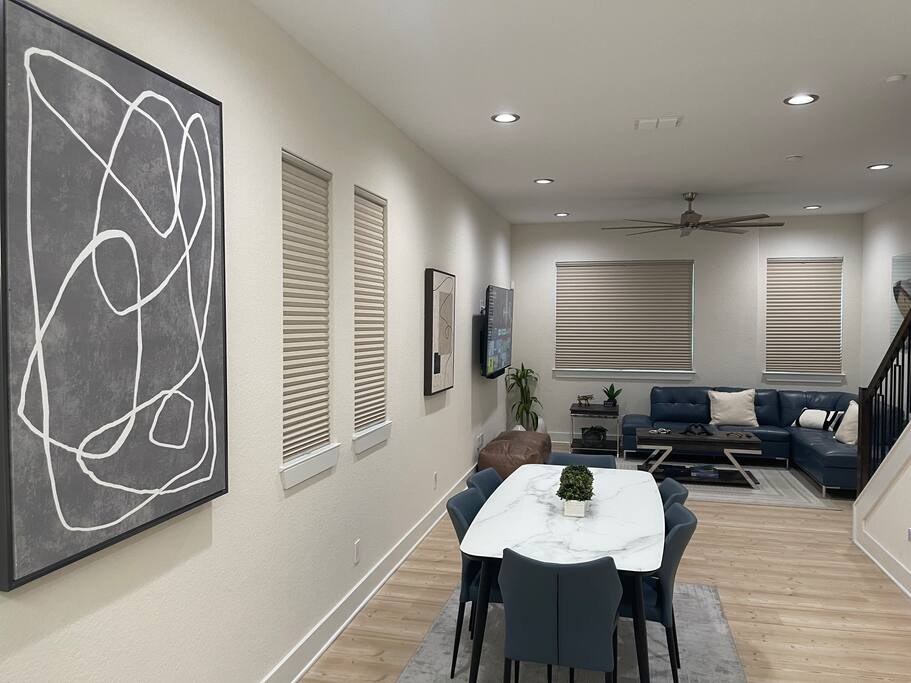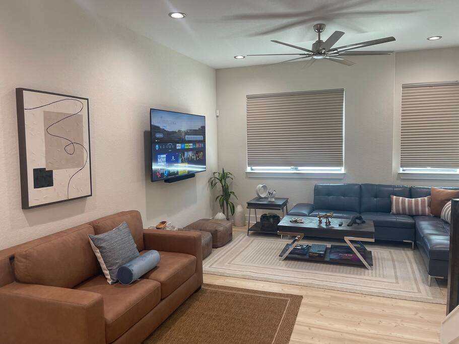 The first floor is an entertainer's dream! Enjoy an expansive living room and dining area, complemented by a chic, fully-equipped kitchen. A cozy sleeper sofa and a convenient half-bath are also on this level. For entertainment, unwind with a movie or your favorite show on the massive 80-inch HD Smart TV.