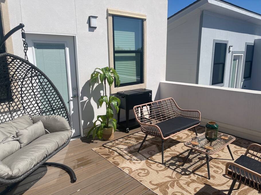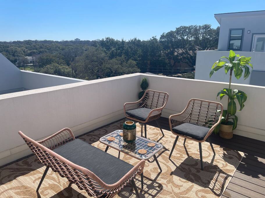 Step outside to the third-floor deck, where you'll find stunning views—perfect for unwinding after a day of sightseeing. The deck is furnished with upgraded lounge chairs and stylish décor, creating the ideal spot for a relaxing evening or enjoying a morning coffee.