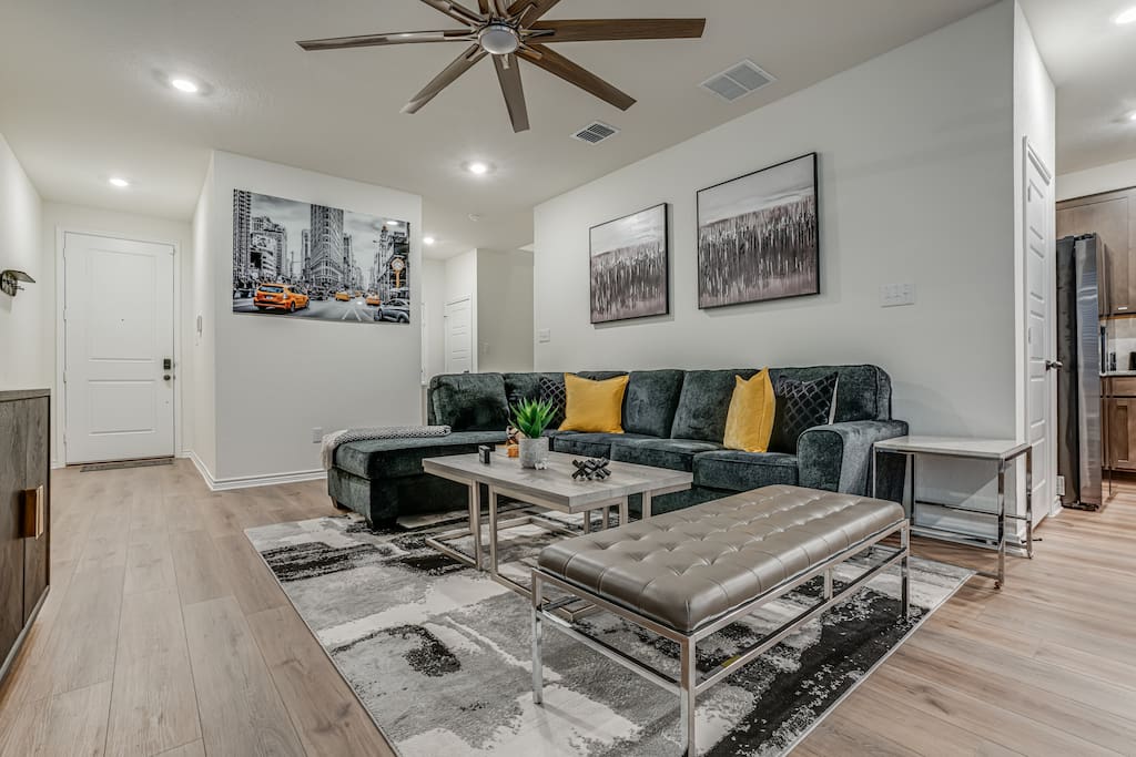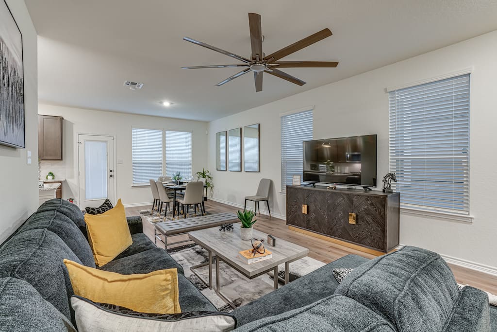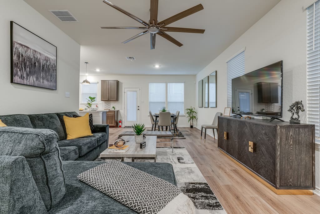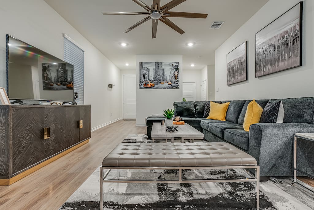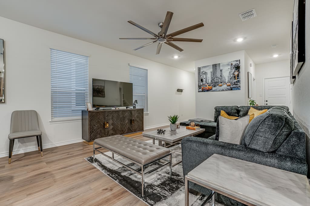 The downstairs living room is designed for relaxation, featuring a 75-inch smart 4K TV for movie nights or sports events.