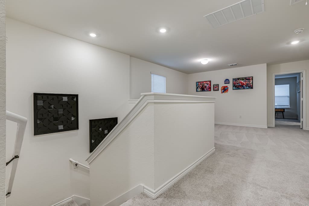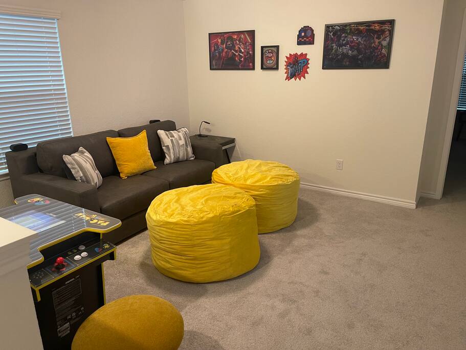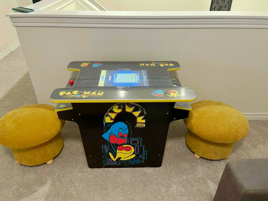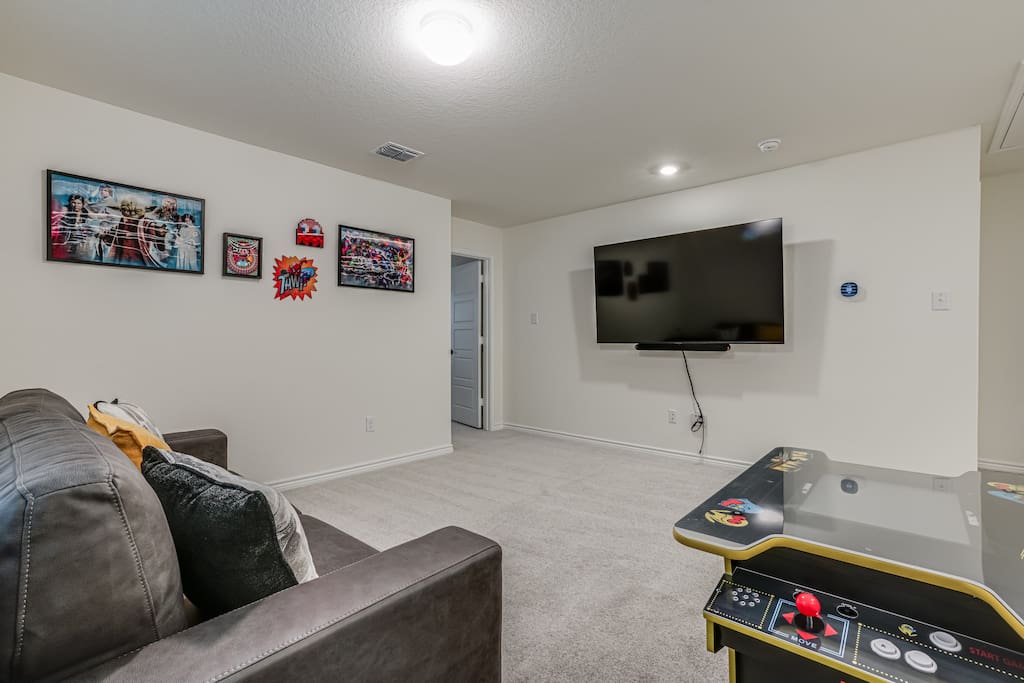The upstairs game room offers another 75-inch smart 4K TV, along with a Pac-Man arcade game, guaranteed to keep both kids and adults entertained for hours!