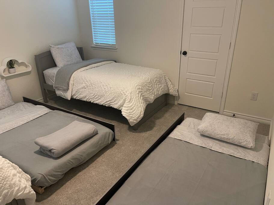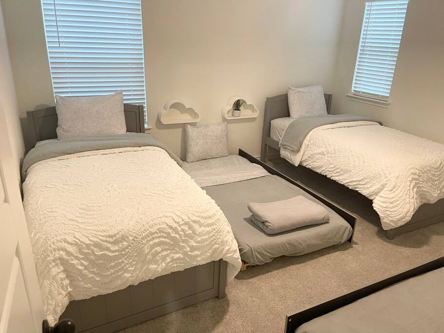 Two additional queen-sized bedrooms offer extra comfort, while the fourth bedroom features two twin beds and two twin trundles, accommodating four.