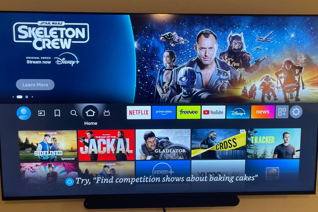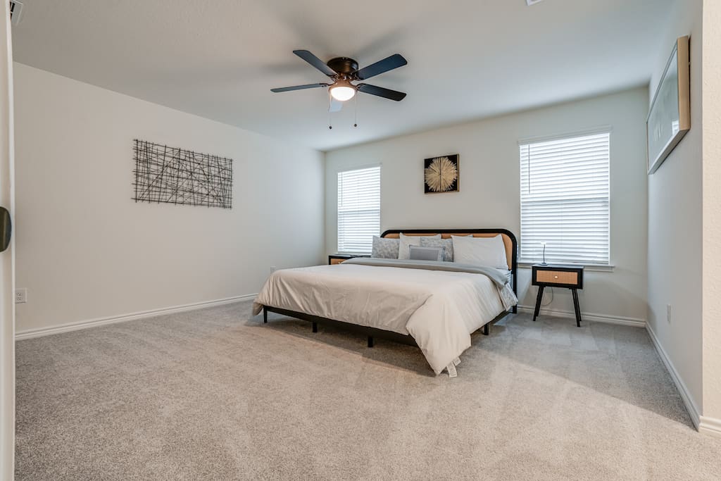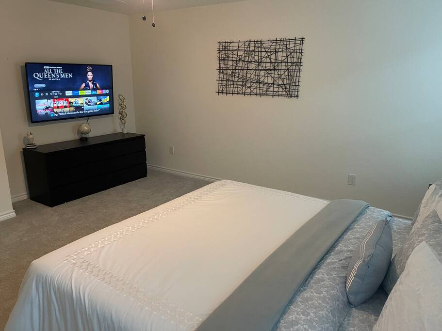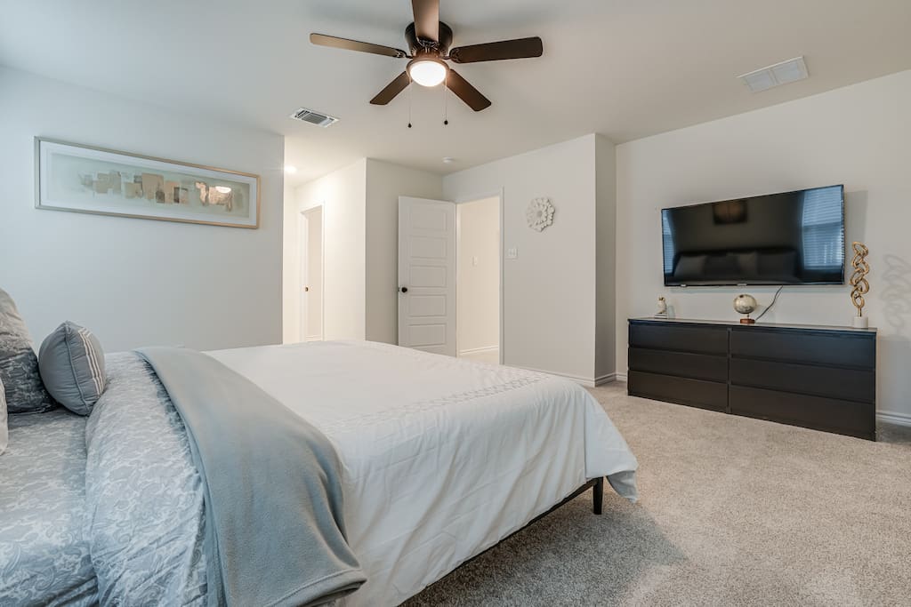 The luxurious master bedroom boasts a king-sized bed, a large 4K TV, and plenty of space to unwind.
