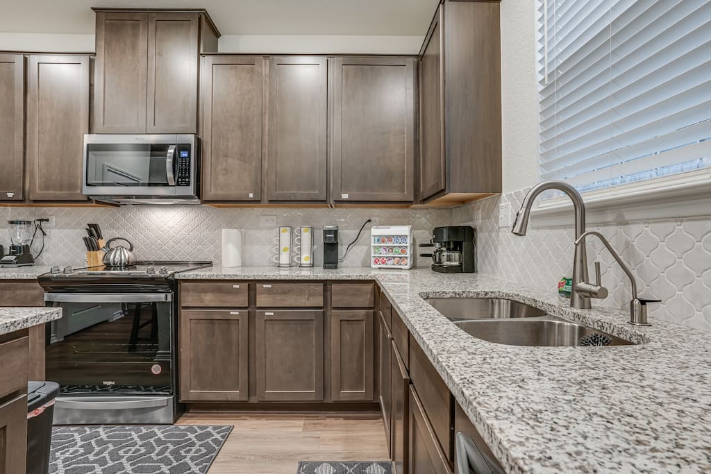 The coffee bar is an added bonus, featuring a variety of K-Cups, creamers, sweeteners, hot chocolate, teas, and an espresso machine—no need for a Starbucks run while you're here!