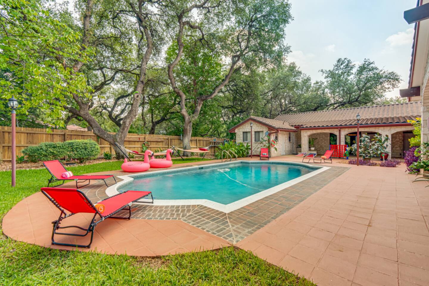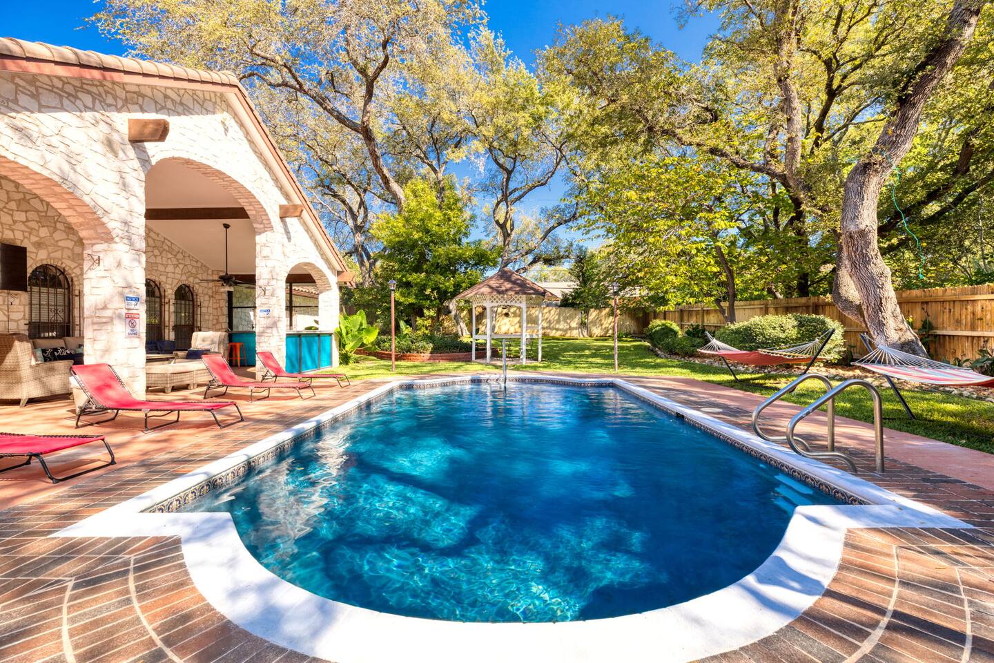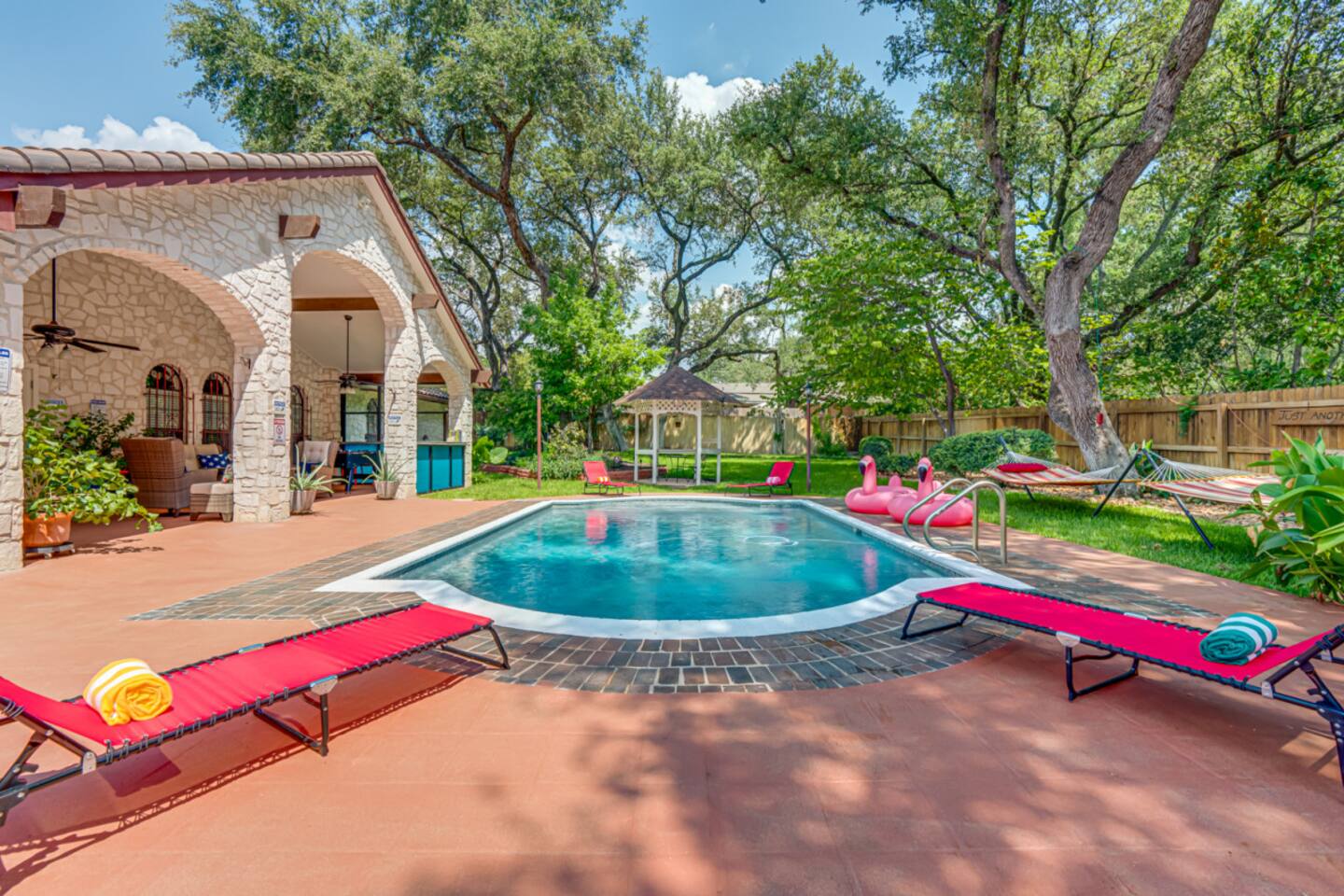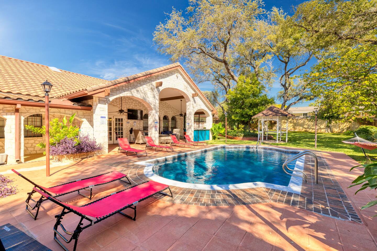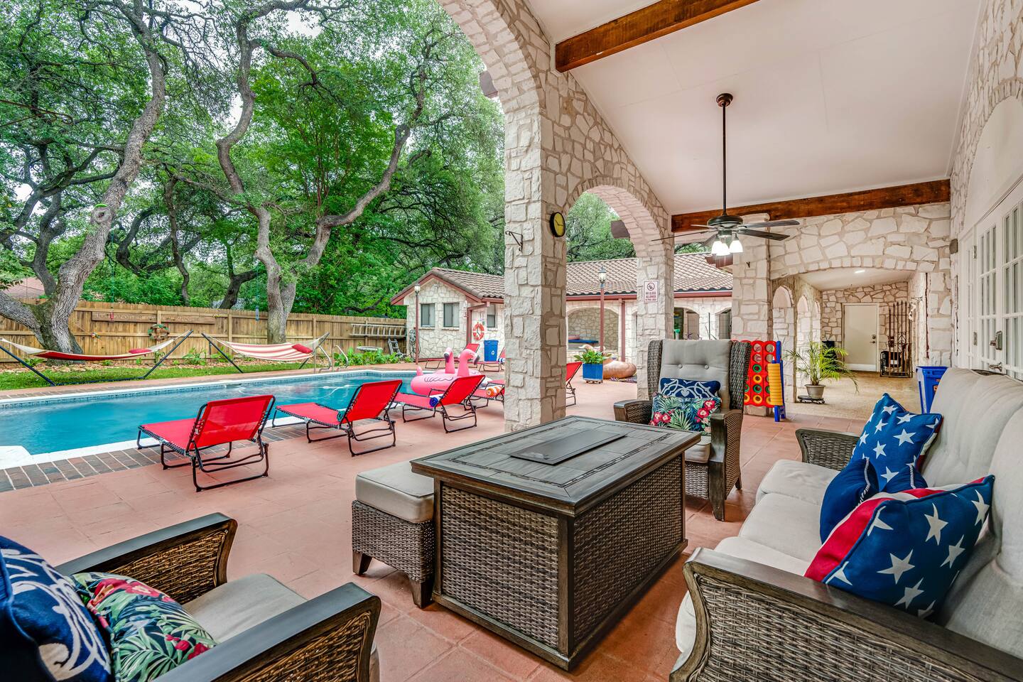 Step outside to your private oasis: a heated pool (88° year-round) surrounded by loungers, hammocks, outdoor games, and lush landscaping.