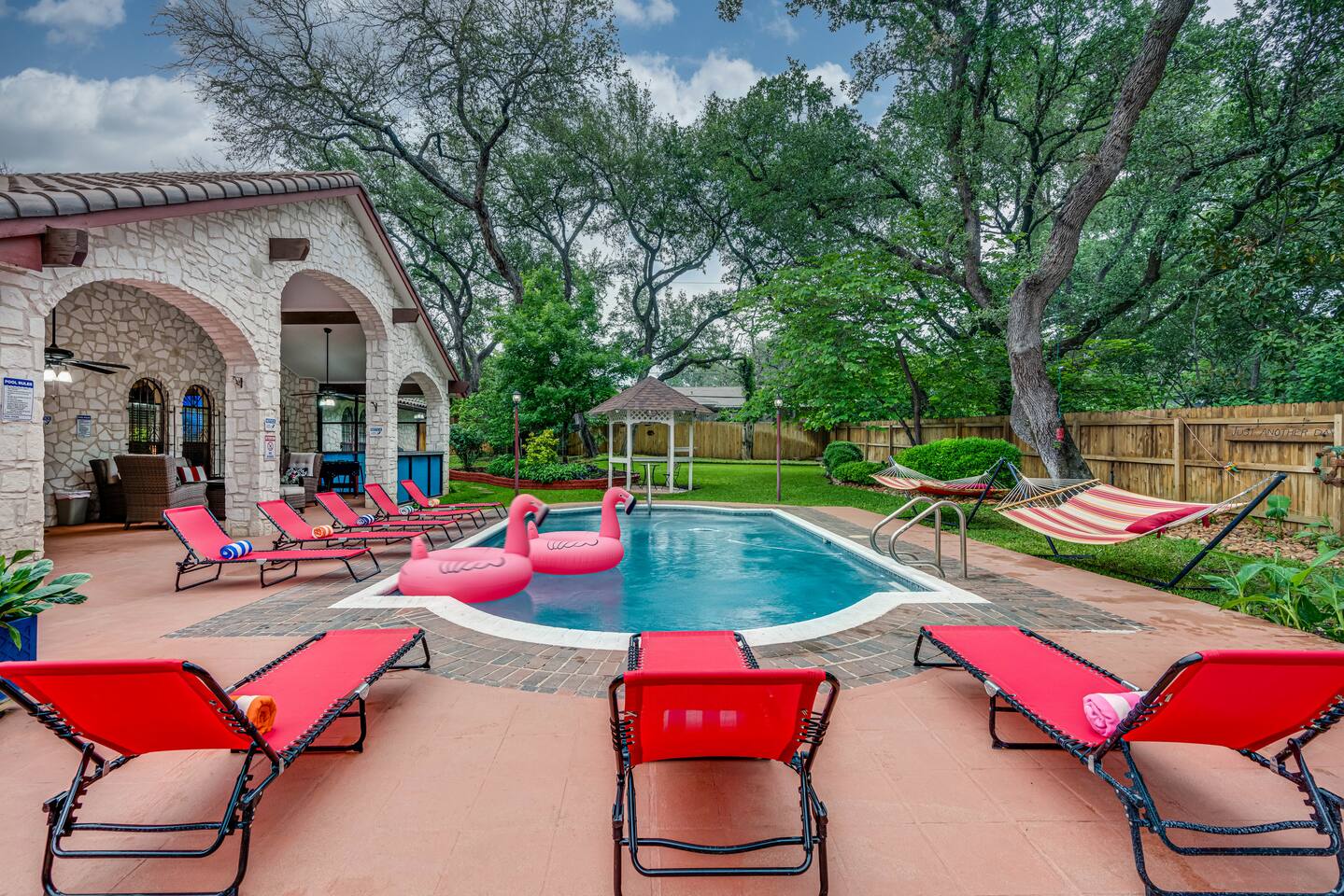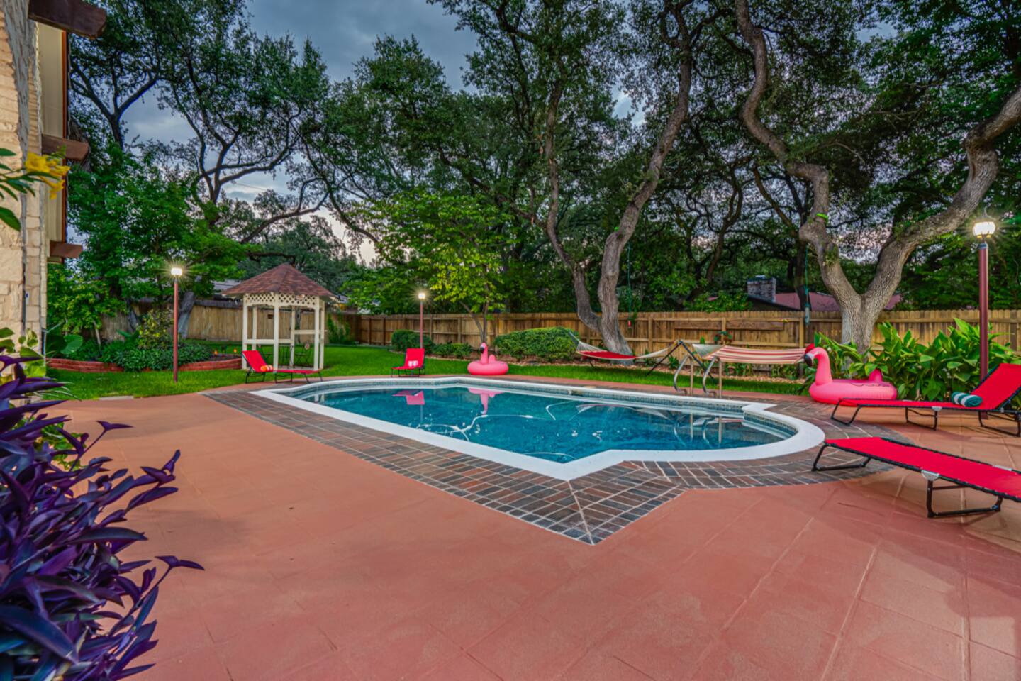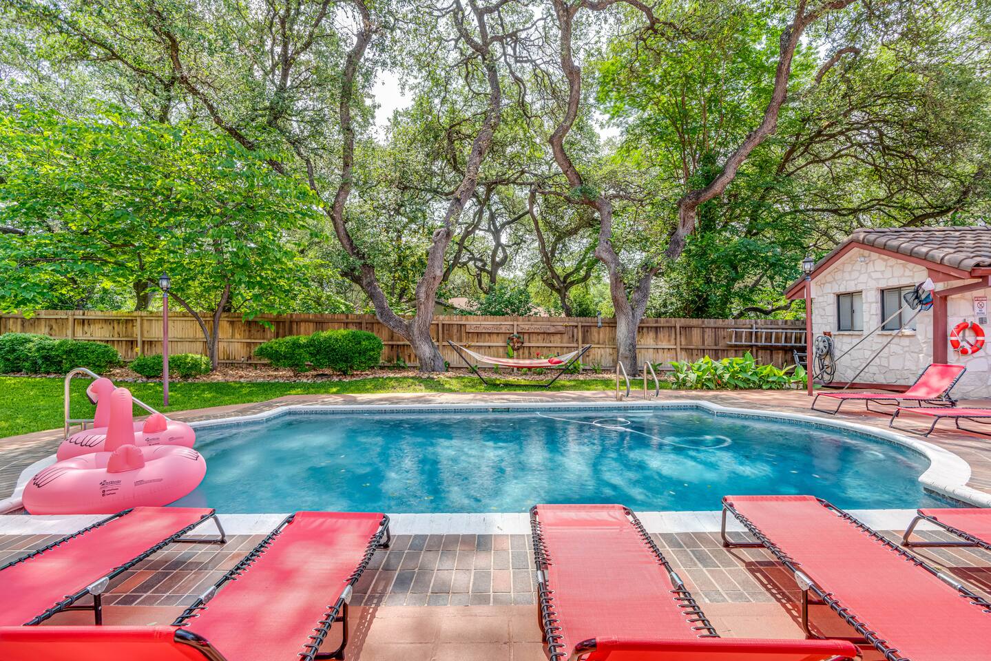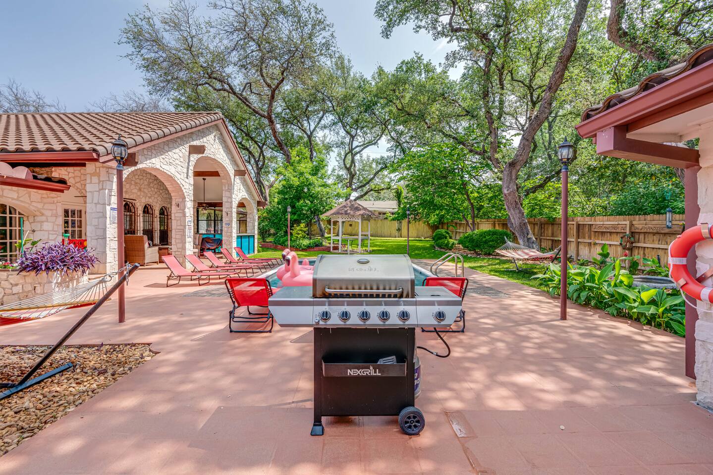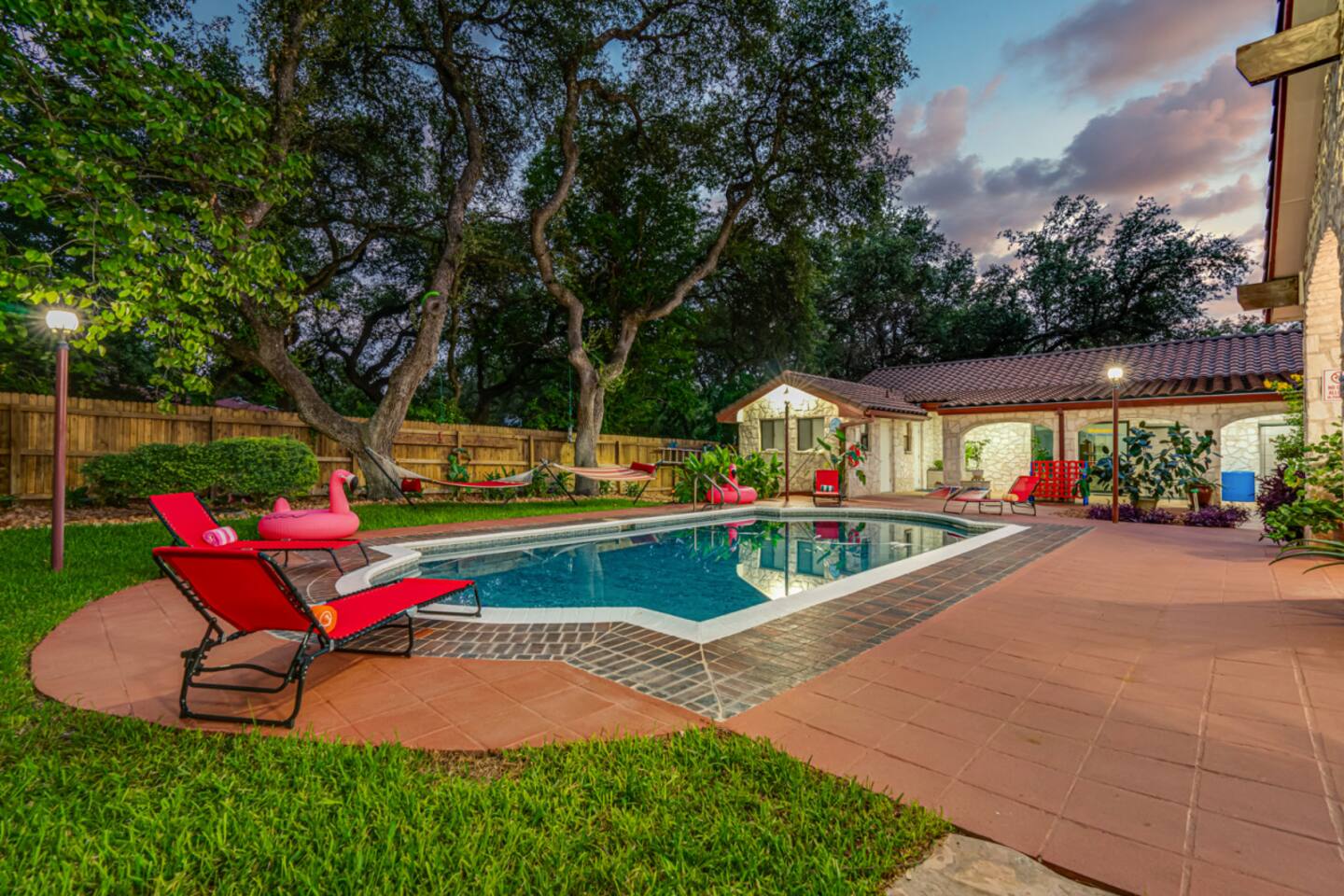 Step outside to your private oasis: a heated pool (88° year-round) surrounded by loungers, hammocks, outdoor games, and lush landscaping.