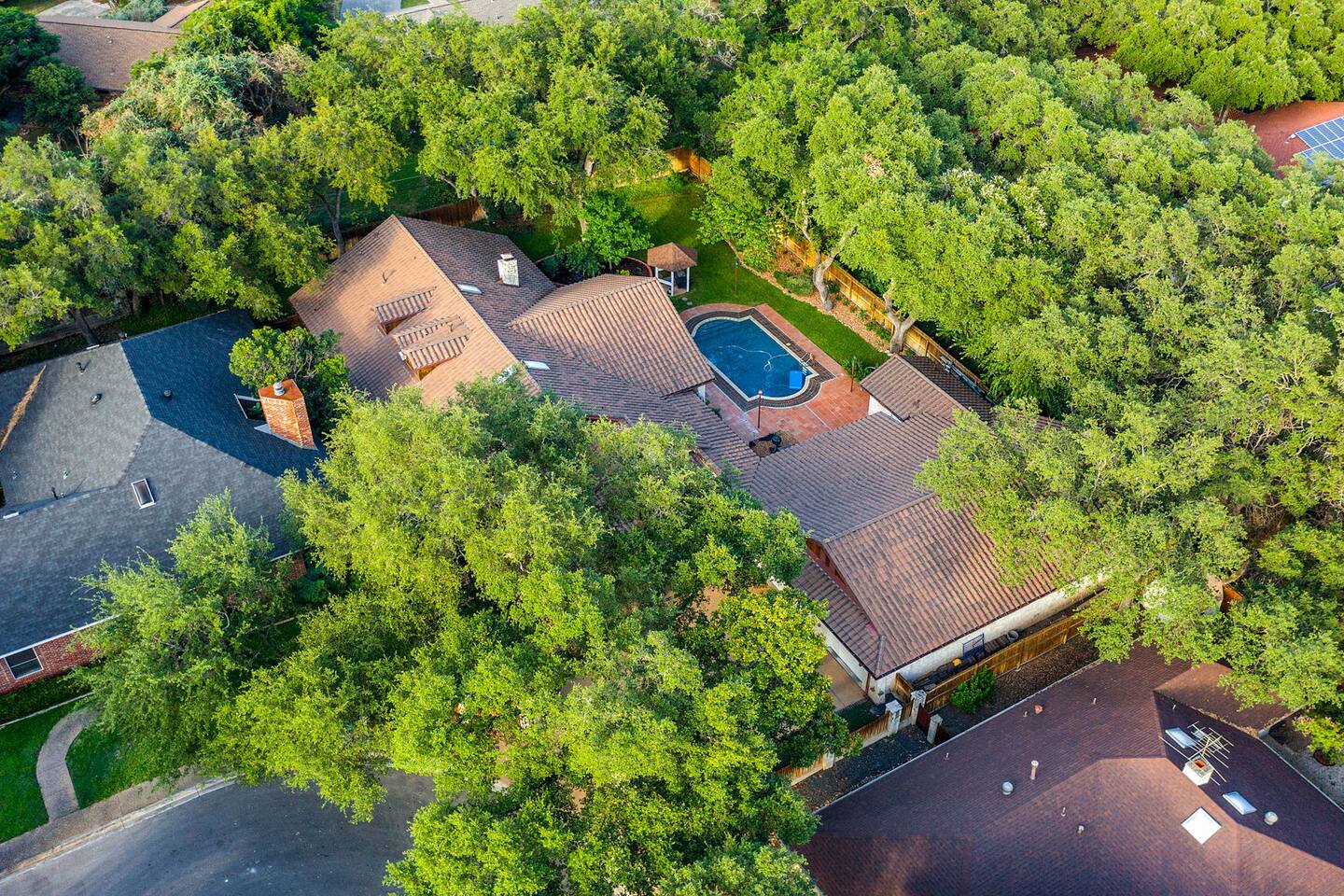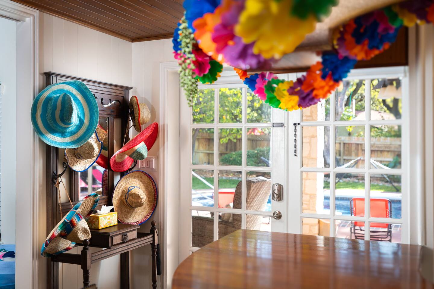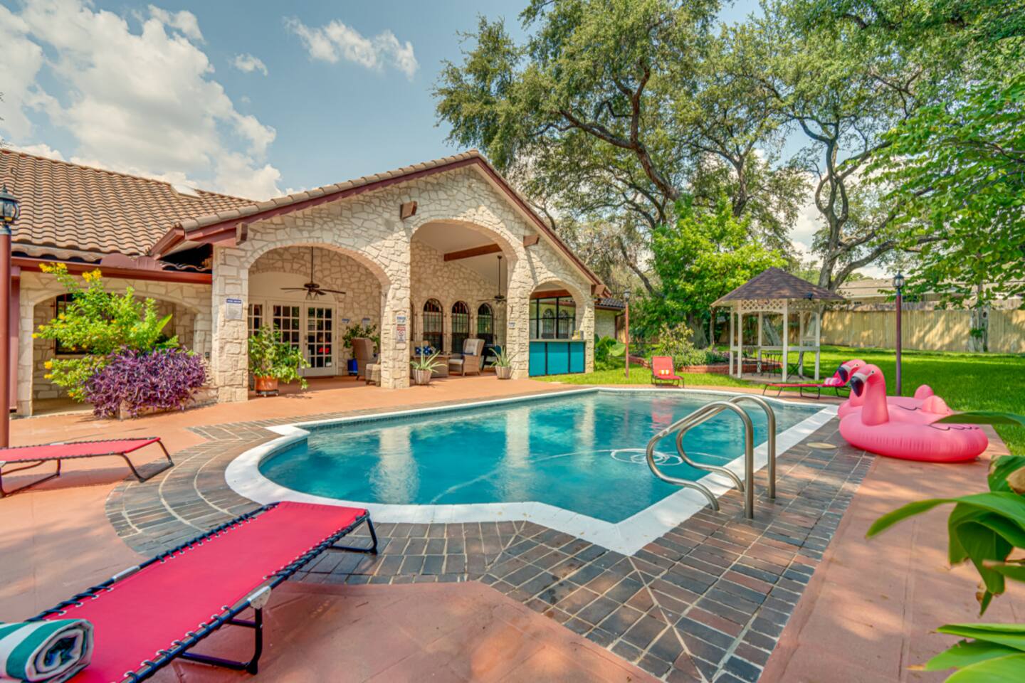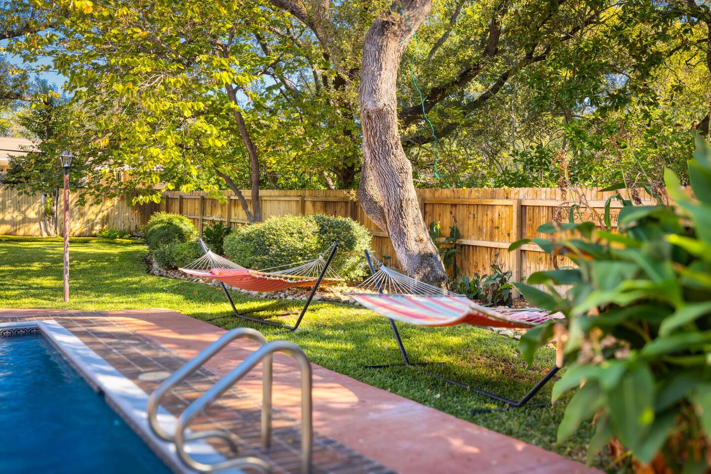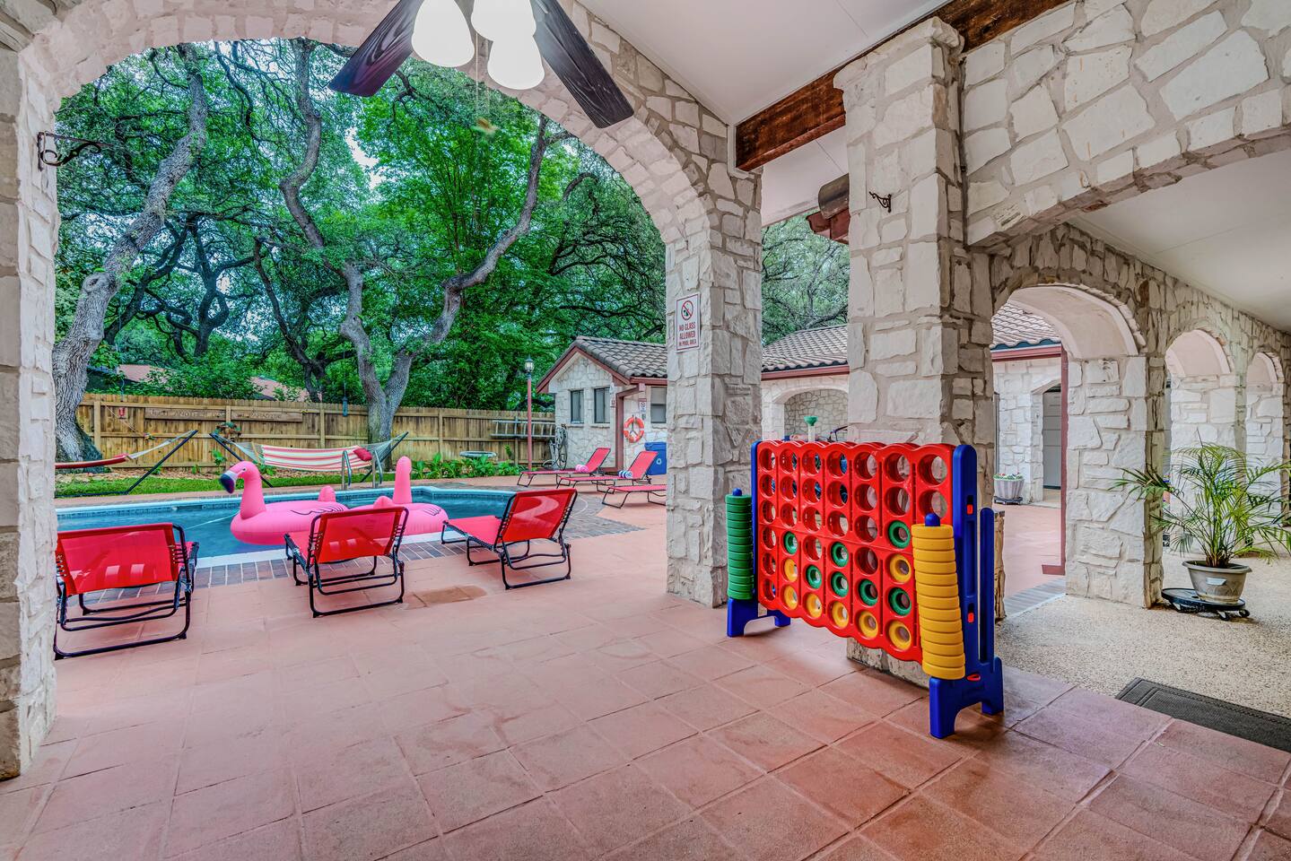 Step outside to your private oasis: a heated pool (88° year-round) surrounded by loungers, hammocks, outdoor games, and lush landscaping.