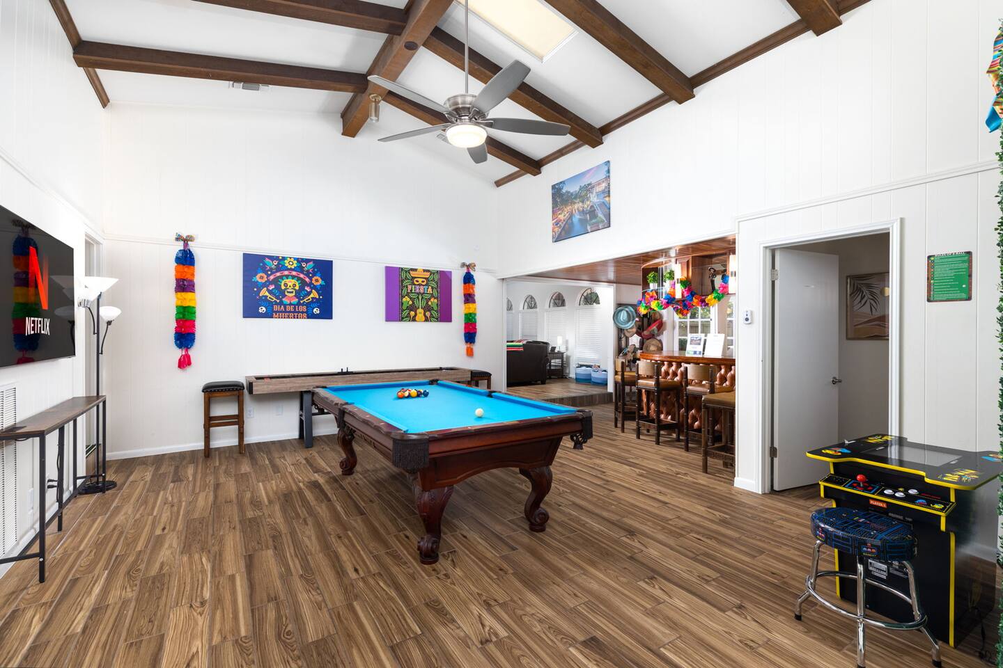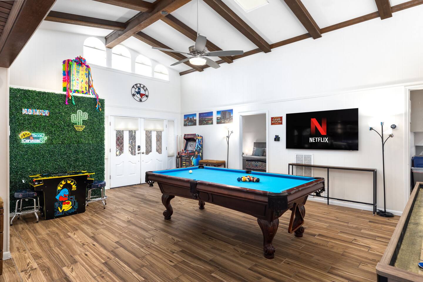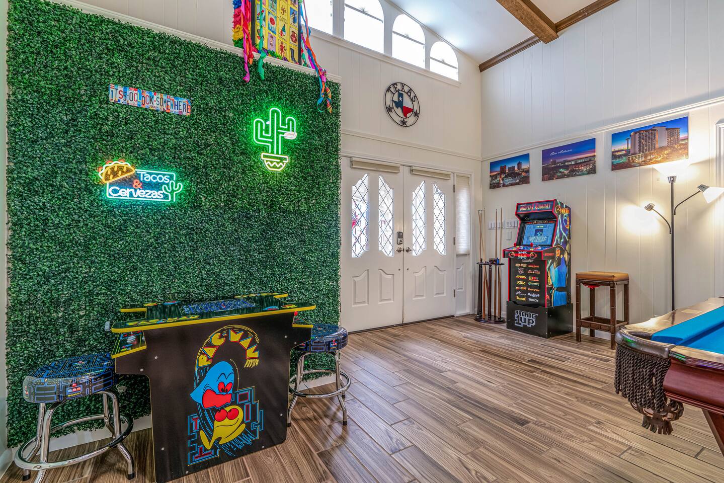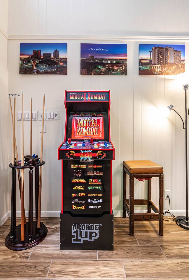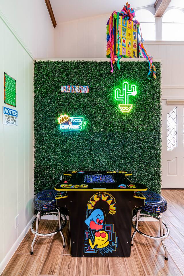 Gather for hours of fun in a professionally designed space featuring a tournament-quality pool table, official shuffleboard, 65" 4K HDR TV, and classic Pac-Man and Mortal Kombat arcades.