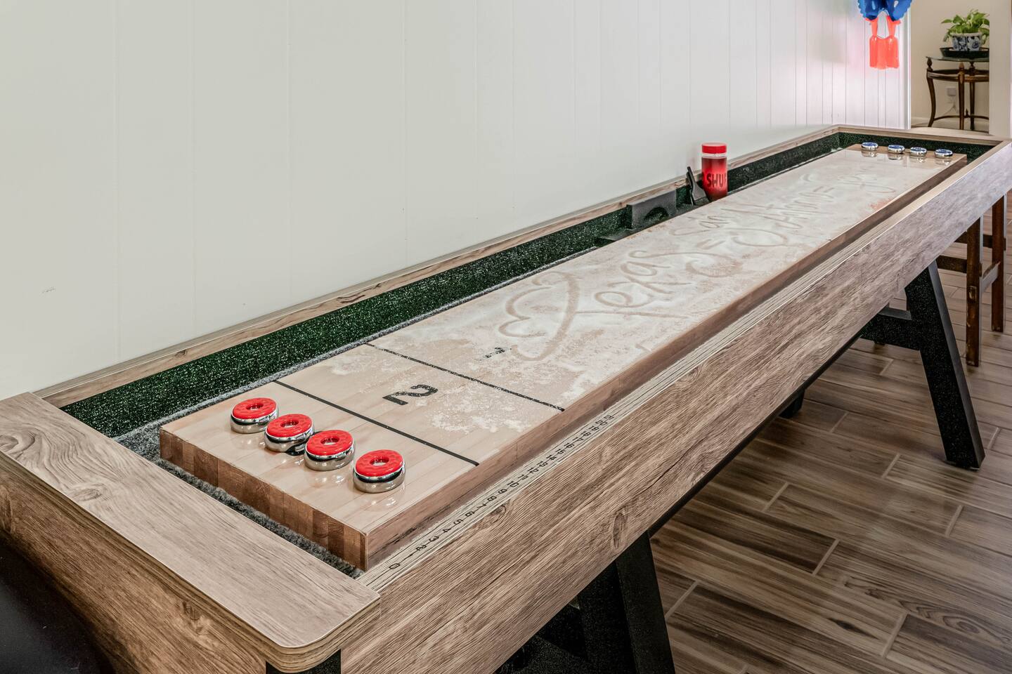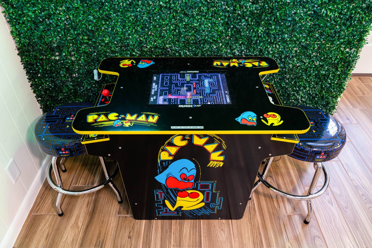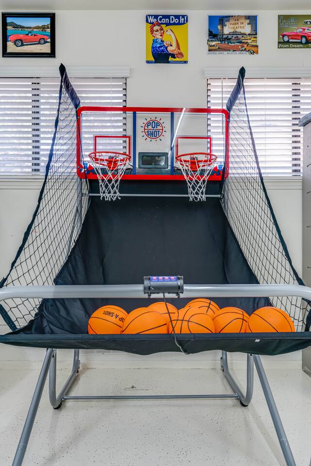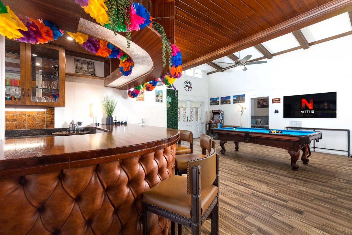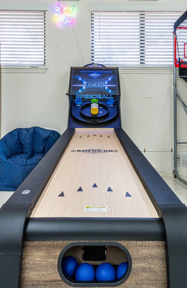 Gather for hours of fun in a professionally designed space featuring a tournament-quality pool table, official shuffleboard, 65" 4K HDR TV, and classic Pac-Man and Mortal Kombat arcades.