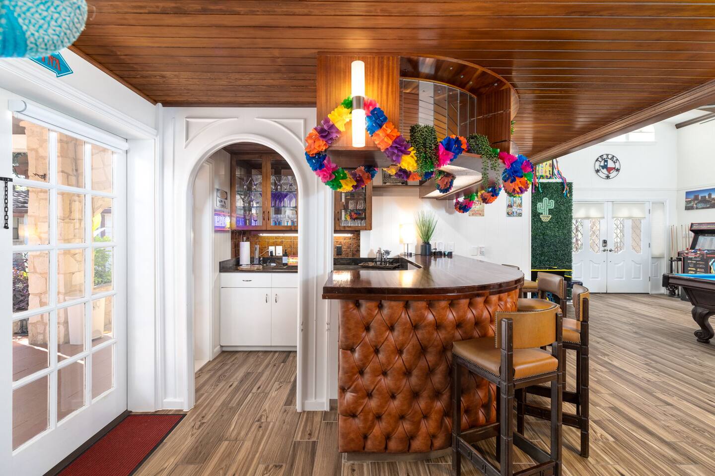 A true showpiece — this mahogany bar, hand-crafted in the Philippines and imported to San Antonio, brings timeless charm to your stay.