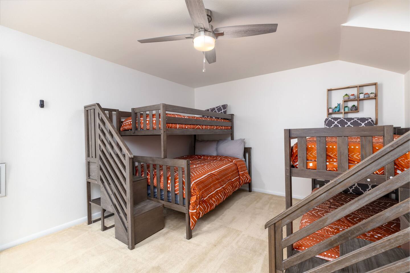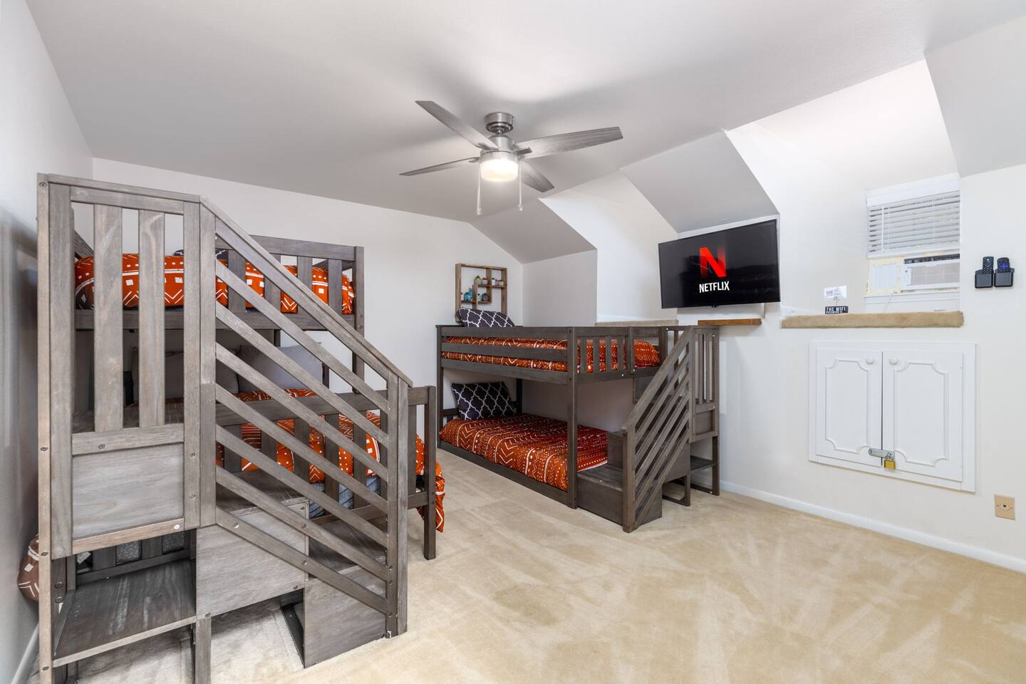 Upstairs Hideaway: Two bunk beds (twin/full + twin/twin) with private bath — perfect for kids