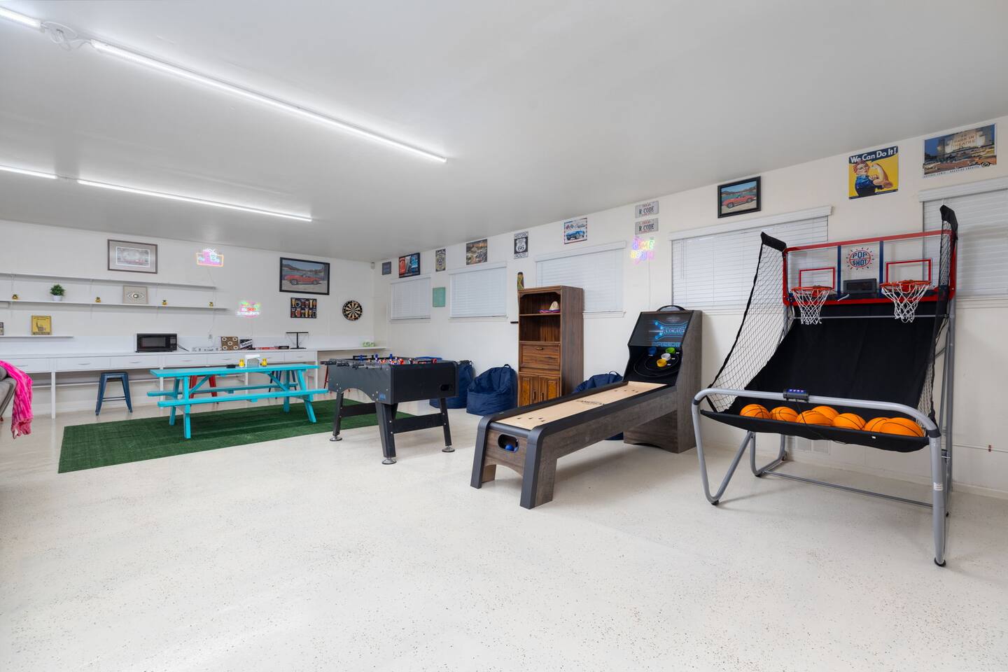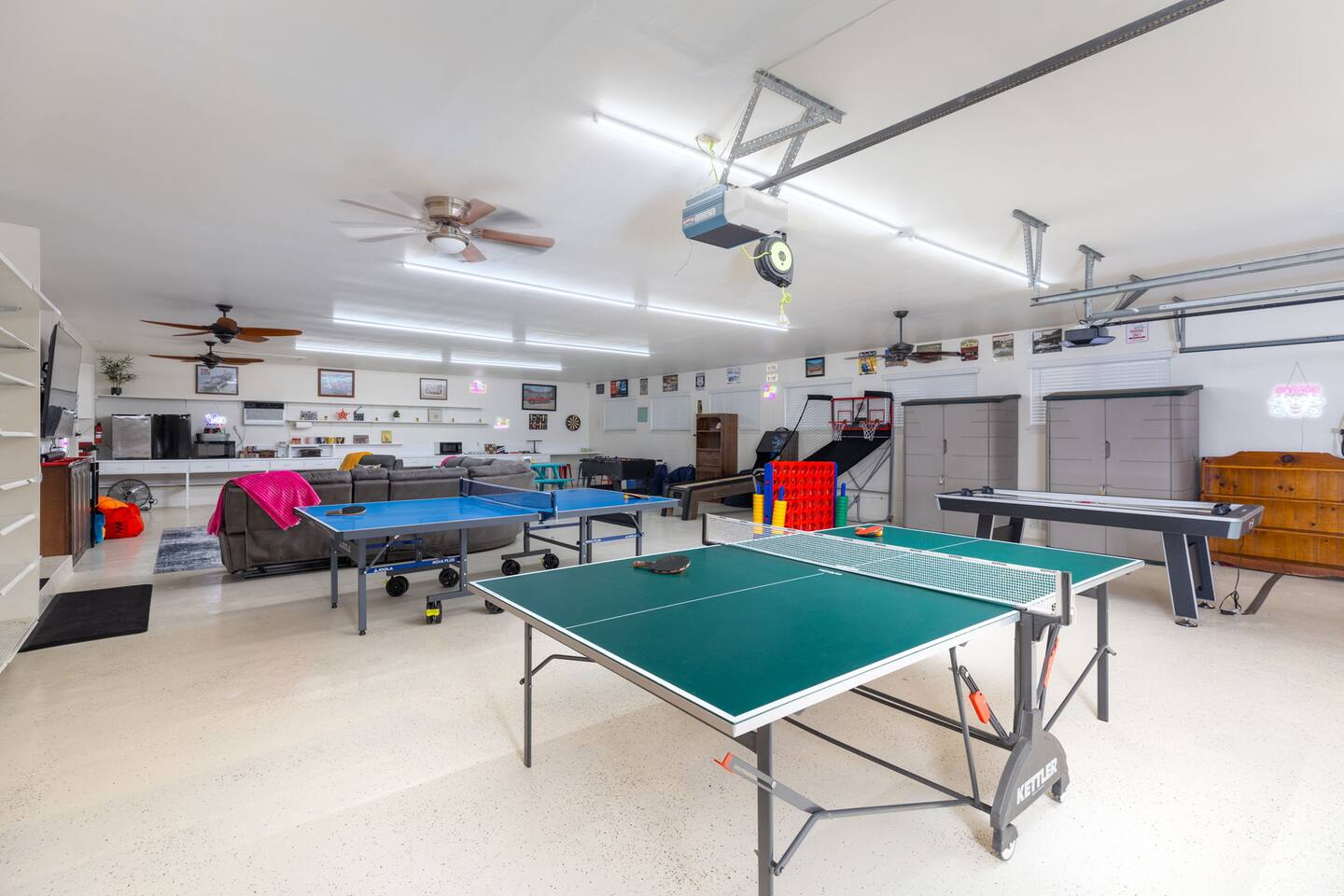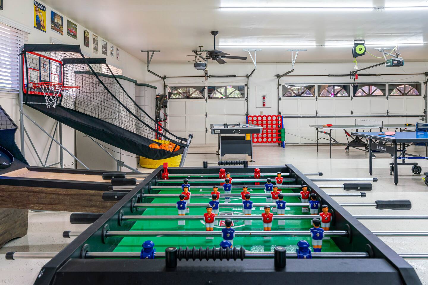 Two ping-pong tables, foosball, skee-ball, pop-a-shot basketball