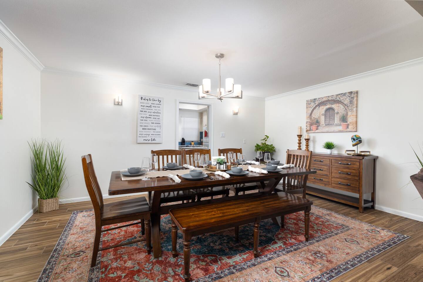 Formal dining for 12 around a farmhouse-style table
